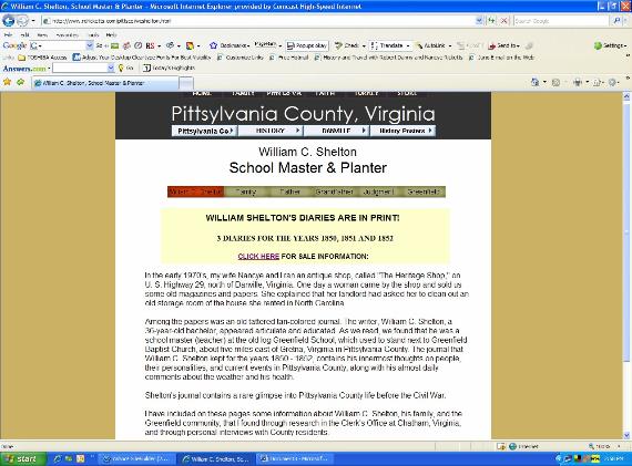 | My sister-like niece Sylvia is back in Danville, Virginia. She and John bought a second house and drift back and forth from Hot Springs Village in Arkansas. My dad died when I was 16 back in the “happy days” of 1957. I inherited the family 1951 Chevy “power slide” and Sylvia helped get together a car load of girls who rode with me to the Civil Air Patrol meetings at the airport and our “cabin” on the farm, which never seemed to get far off the ground. D.A.R. Sylvia Lee Lynch Matthews is a prolific producer of paperwork for the Daughters of the American Revolution (DAR). She made the Ricketts family famous in Arkansas, actually convincing them that we had accomplished something. In 2006, Sylvia invited us to Arkansas and I was presented both the NSDAR awards for History and Historic Preservation. My son Bobby, grandson Joey also received awards from the DAR and we all received the beautiful Arkansas Traveler Awards, which are signed by the Arkansas governor and secretary of state. See our DAR Awards page. Shelton Diary Lately, Sylvia has been a great help in finishing up the publication of an important and interesting diary for three years beginning in January of 1850. We now have the years of 1850, 1851 and 1852 listed separately on EBAY with Southside Books [NOTE: this was in 2007; the books are now out of print]. My wife and I have had this handwritten treasure for about 35 years. We bought a house on US 29 in 1972 where we began an antique shop called The Heritage Shop. We had JoAnn, age three, Bobby, age one, and then came Paul in 1973. Nancye was running the shop in her “spare” time while I carried mail and attended college for the GI Bill money three nights a week. A lady came in from North Carolina with some old magazines and the 1850-52 diary and sold them to Nancye. The lady promised to bring more old "magazines" to our shop, but we never saw her again. She said the landlord told them to clean out that old room, so instead of bringing it up to Danville, they may have thrown away everything else in the old house. Sadly, inside the cover of the diary was written “20th Album.” The writer of the diary was William Christopher Shelton (1814-1869). At the time of writing the diaries we have, he taught in a one-room log schoolhouse near the Greenfield Baptist Church, located about five miles east of Gretna, Virginia, in Pittsylvania County. His great grandfather Crispen Shelton came to the waters of Whitethorn (also called Panther) Georges Creek in 1762, five years before the formation of Pittsylvania County in 1767. Crispen had eleven children. When he died in 1794, he gave his youngest son Vincent Shelton, Sr. (Wm. C.’s grandfather) land and five of his 51 slaves. They were West, Essex, Betty, Rhoda and Edy. Vincent Senior was born in 1754 and served as an officer during the Revolutionary War. Wm. C. Shelton’s father was Capt. Vincent Shelton, Jr. who was born in 1792 and married Nancy Waller in 1813. Capt. Vincent was a Deputy Sheriff and served as a captain during the War of 1812. In addition to William C. Shelton, the Sheltons also had another child named Elizabeth Ann Shelton, born in 1816, who married William Stone in 1837. After he died, Elizabeth married William B. Swann of “Woodfern.” Swann gave the land for the Pelham, North Carolina Methodist Church. Pelham is a small community near the state border with Virginia. Elizabeth and William’s mother Nancy Waller Shelton died in 1875 and is buried in the church graveyard. The old home place where the diary was found and the Swann family lived is northwest of the church on the eastern side of the present highway US 29. William Shelton had hard times after the Civil War and met a tragic end. The first volume for 1850 has the story about his life after the 1850s. We have a section under Pittsylvania County, Virginia called William C. Shelton. Our next project is to publish the diary of a Danville attorney who was a Confederate captain who became very wealthy after the War. |