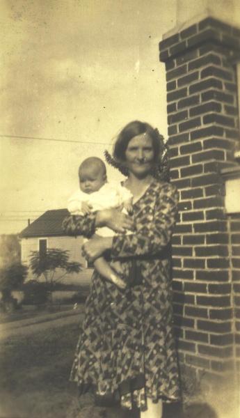 | ABOVE: Nancye Ricketts with Bobby and JoAnn, camping in 1972. RIGHT: Marie (Jones) Ricketts with baby Danny Ricketts in 1941. BELOW: James Lynch and future wife Idella Ricketts often took Idella's baby brother Danny Ricketts on their dates. The boy at left was walking by with his pony and little Danny got to ride. |