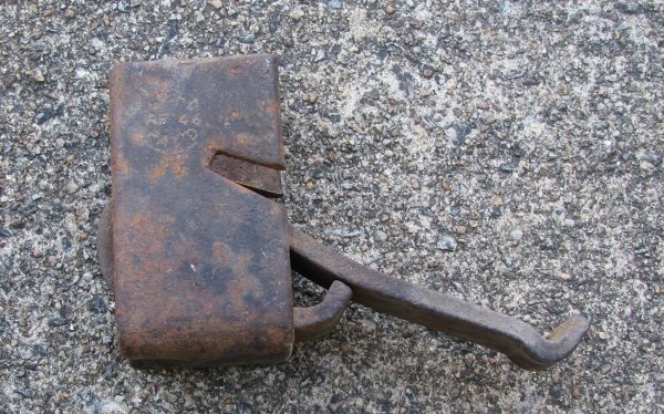 This gadget was by the railroad tracks near the double arched Double Creek bridge trestle. We haven’t figured out what it was used for. (update: Experts tell me this device clamped underneath the track on either side of the wooden tie to keep the track from shifting lenthwise. It is not a old as it looks.)Here is the area from an 1895 map: