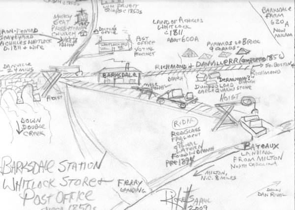 Between the bridge and the depot site we picked up shop-made railroad spikes of varying sizes. They appear be original to the 1850s. From the area where we believe the depot was constructed, we found a path on an even grade to the southeast to the Dan River. At the river, where a small branch enters, there was a deep cut out back in the bank. We believe that this may have been the landing for the bateaux, which carried freight to and from Barksdale Station and Milton, North Carolina, which is eight miles upstream. Here’s a ten-minute quick sketch of what we found. Improvements are coming when I get in the mood.