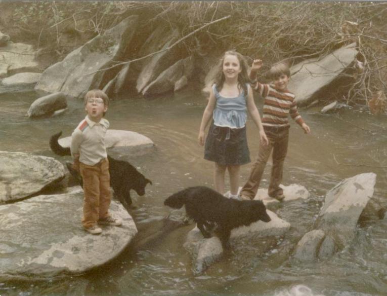 | Paul, JoAnn, and Bobby Ricketts with the family dogs at Sandy River, on our farm at Soapstone in Pittsylvania County, Virginia |