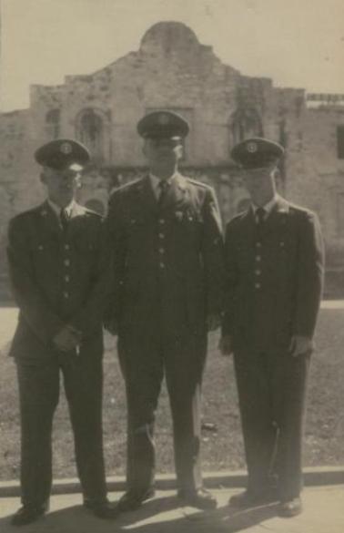 | 1961 - Danny Ricketts (right) and two airmen friends just after basic training, stand in front of the Alamo. |