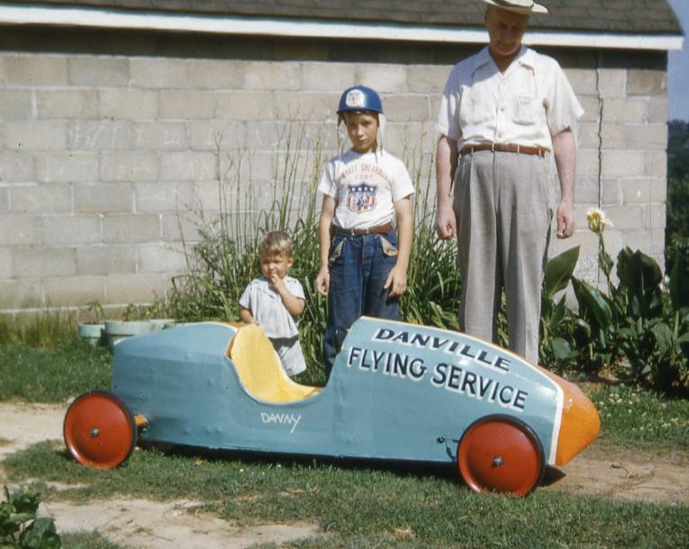| SOAP BOX DERBY driver Danny Ricketts, his dad Reuben E. Ricketts, and Danny's little cousin Mark Reynolds admire Danny's car in 1953. (BELOW) |