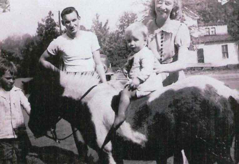 | ABOVE: Nancye Ricketts with Bobby and JoAnn, camping in 1972. RIGHT: Marie (Jones) Ricketts with baby Danny Ricketts in 1941. BELOW: James Lynch and future wife Idella Ricketts often took Idella's baby brother Danny Ricketts on their dates. The boy at left was walking by with his pony and little Danny got to ride. |