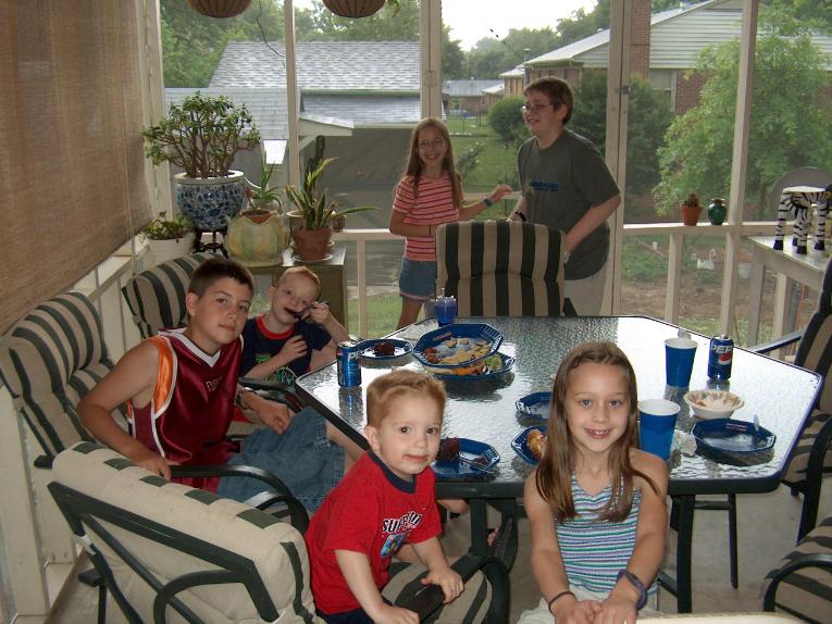 | On our screened porch in 2004: Counter-clockwise from front: Sarah Barbour, Sammy Ricketts, Joey Ricketts, Caleb Ricketts, Elizabeth Barbour, Ryan Hill. The boys are our grandsons and the girls are our nieces. |