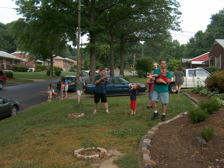 | Our sons Bobby and Paul Ricketts playing in our front yard with some of the grandchildren. Paul is holding his son Samuel, while Bobby is taking a picture of Paul's other son Caleb. Joey (Bobby's son) is standing behind Paul. Jo's son Ryan (olive green shirt) is walking over to the group. In the background: Nancye's nieces Sarah and Elizabeth Barbour, Nancye's sister Joy Barbour, Rebecca Ricketts (Paul's wife). 2004. |