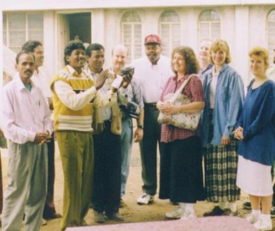 ROBERT: Another morning, Robert A., John, Nancye and I went to a village and stopped on the road at the  home of Christian leaders. This family owns a large tract of land with a nice little house and are building a larger  brick house nearby. They have a large well about 25 feet in diameter. The water ten or fifteen feet down was  clear with small fish swimming around.